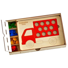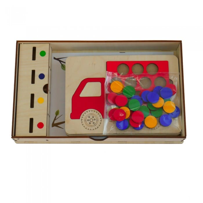 • Деревянная коробка, в которой удобно хранить игру, служит еще и основой для сортировки - попросите ребенка распределить кружочки, соответственно цвету в ячейки сбоку коробки. Развиваем таким образом мелкую моторику, цветовосприятие и внимание.