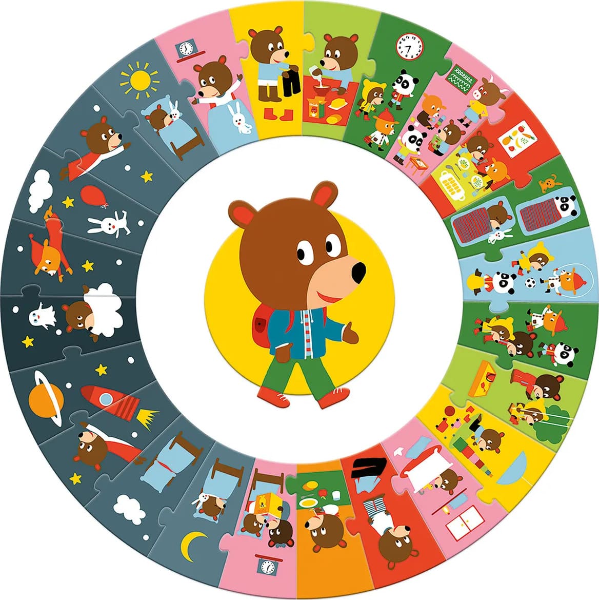 Главный герой пазла — забавный мишка, который делится с малышом своими впечатлениями и событиями за день, знакомит с обычным распорядком дня. Ваш ребёнок с радостью повторит времена суток, вспомнит, чем же он сам занимался вчера и построит план дел на сегодня.