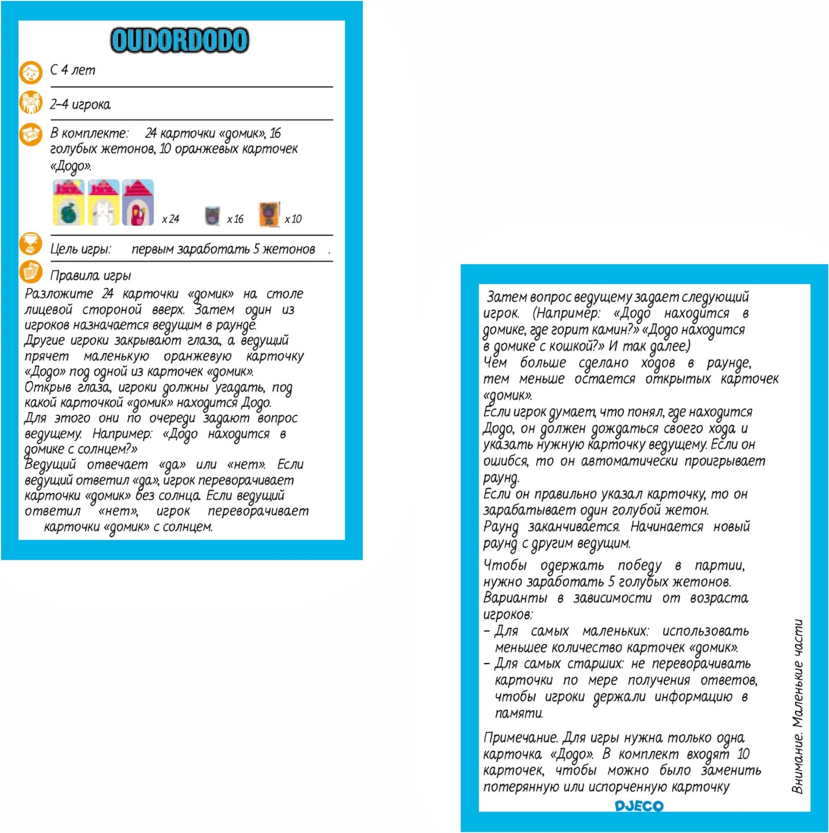 • В наборе: 24 карты, 16 жетонов, 10 карточек с Додо (одна для игры и 9 запасных).