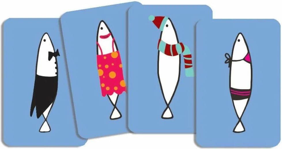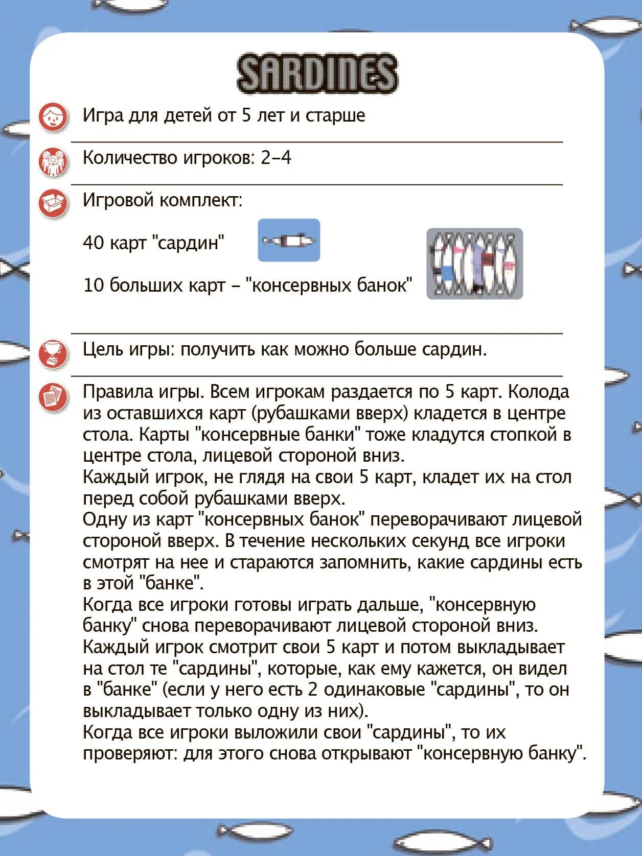 • В комплекте: колода состоит из 50 карт, 40 игральных карт сардины и 10 больших карт консервные банки.