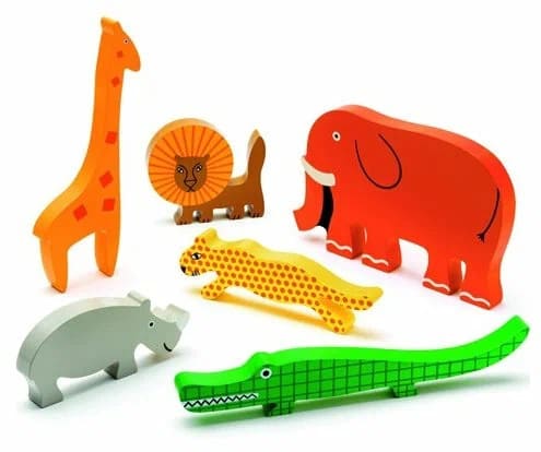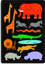 В комплект входит рамка-основа черного цвета и двенадцать фигур в виде различных африканских животных (носорогов, слонов, зебр, львов, жирафов и пр.).