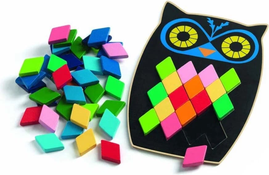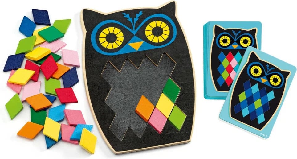 Игра представляет собой деревянную основу в форме совы, в которую нужно разместить яркие ромбики согласно карточкам-заданиям или по своему желанию. В сову вы сможете разместить сразу целых 18 цветных ромбиков, которые делают птицу еще ярче и интереснее.