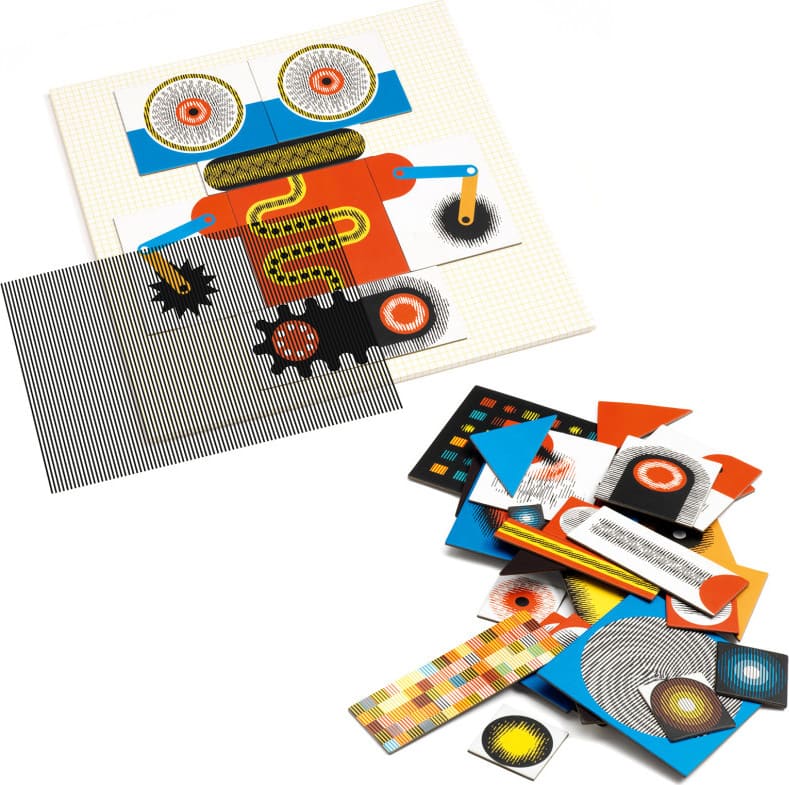 В комплекте вы найдете магнитную доску-основу, а также множество разных деталей пазла. С помощью деталей пазла и книжки с примерами ребенок должен собрать картинки забавных роботов, а затем, приложив специальный прозрачный лист, провести по картинке.