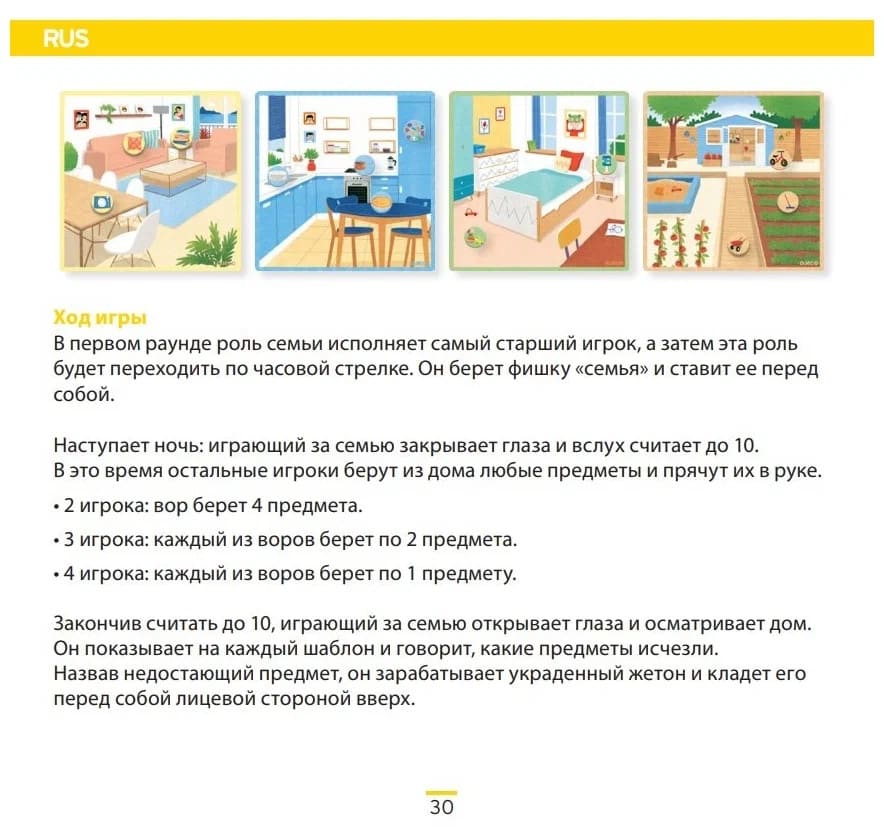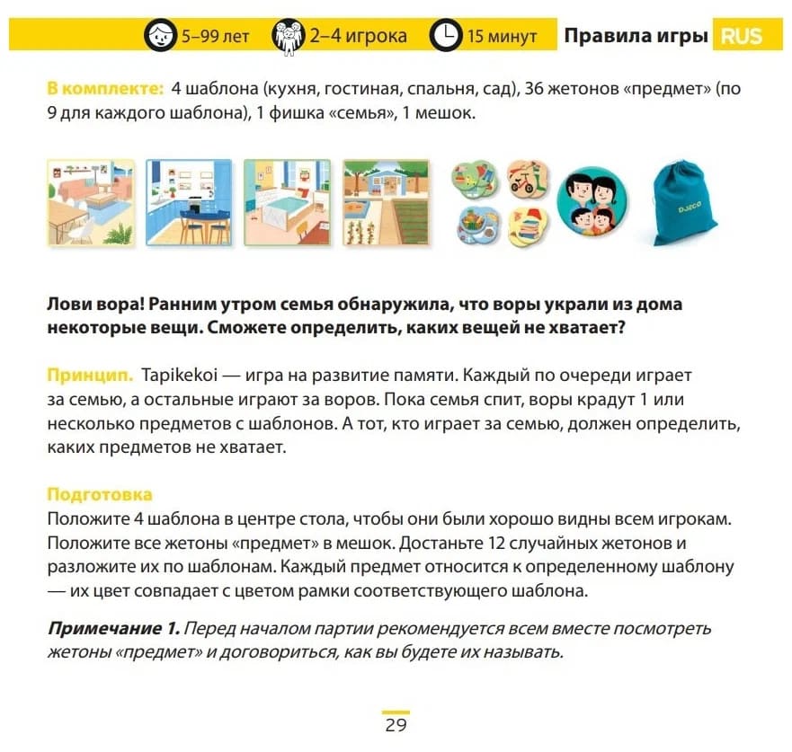 • Комплектация: 4 шаблона (кухня, гостиная, спальня, сад), 36 жетонов «предмет» (по 9 для каждого шаблона), 1 фишка «семья», 1 мешок, подробная инструкция на русском языке.
