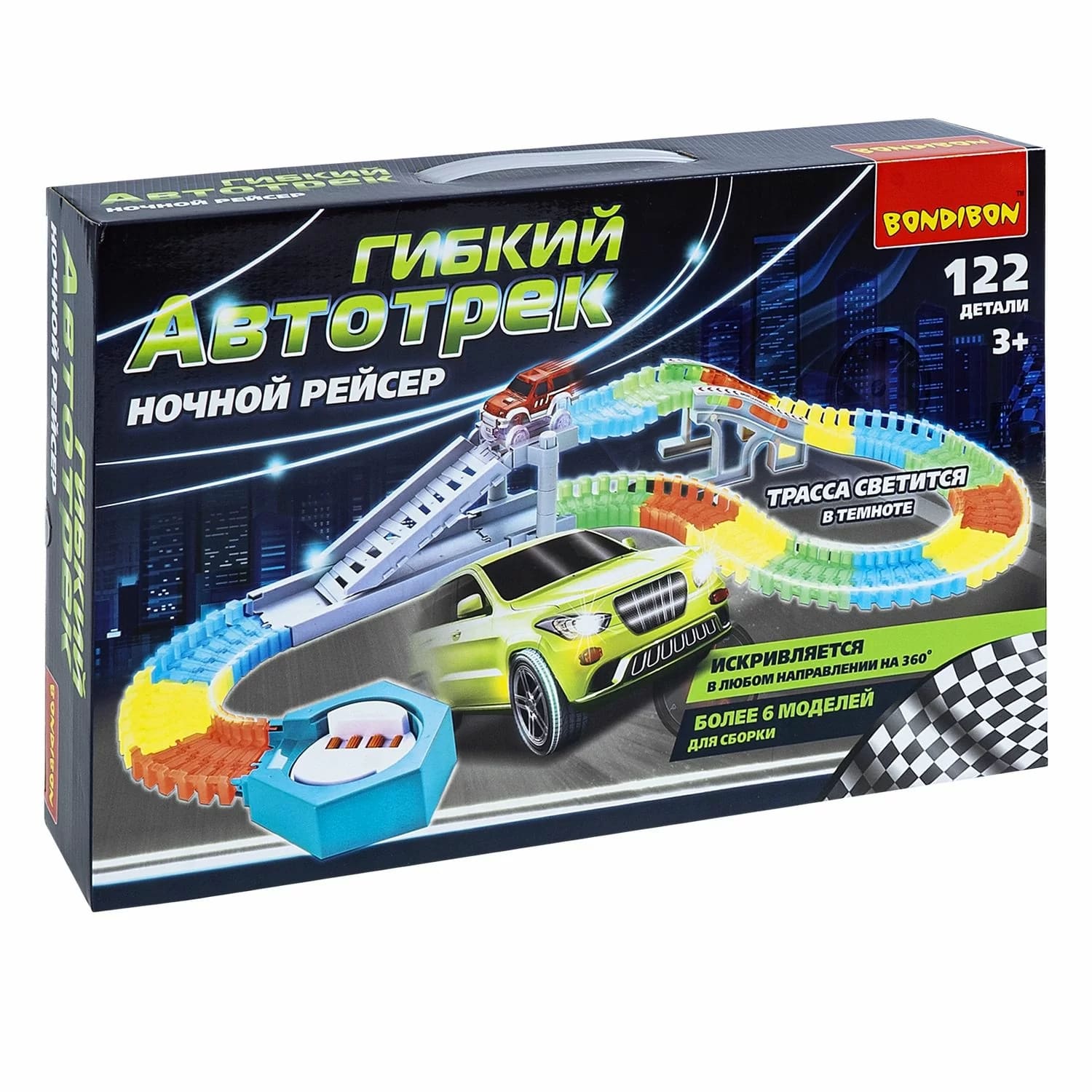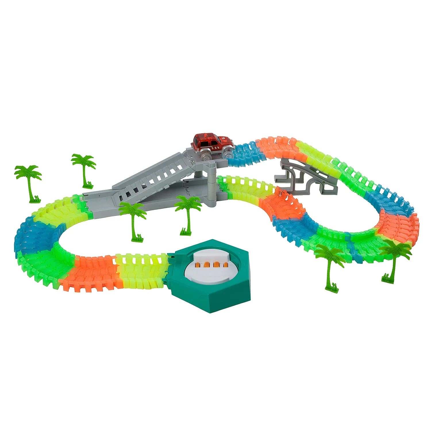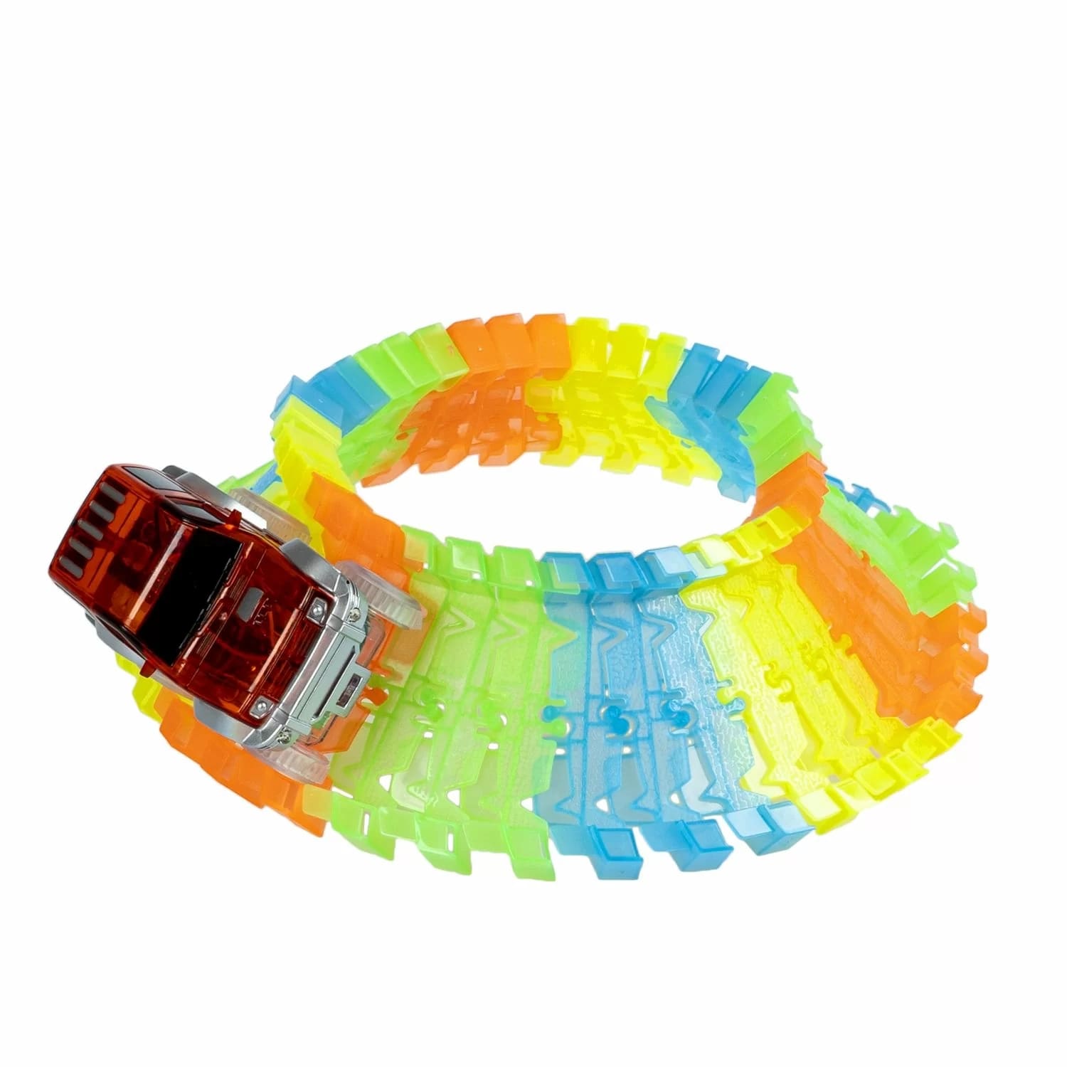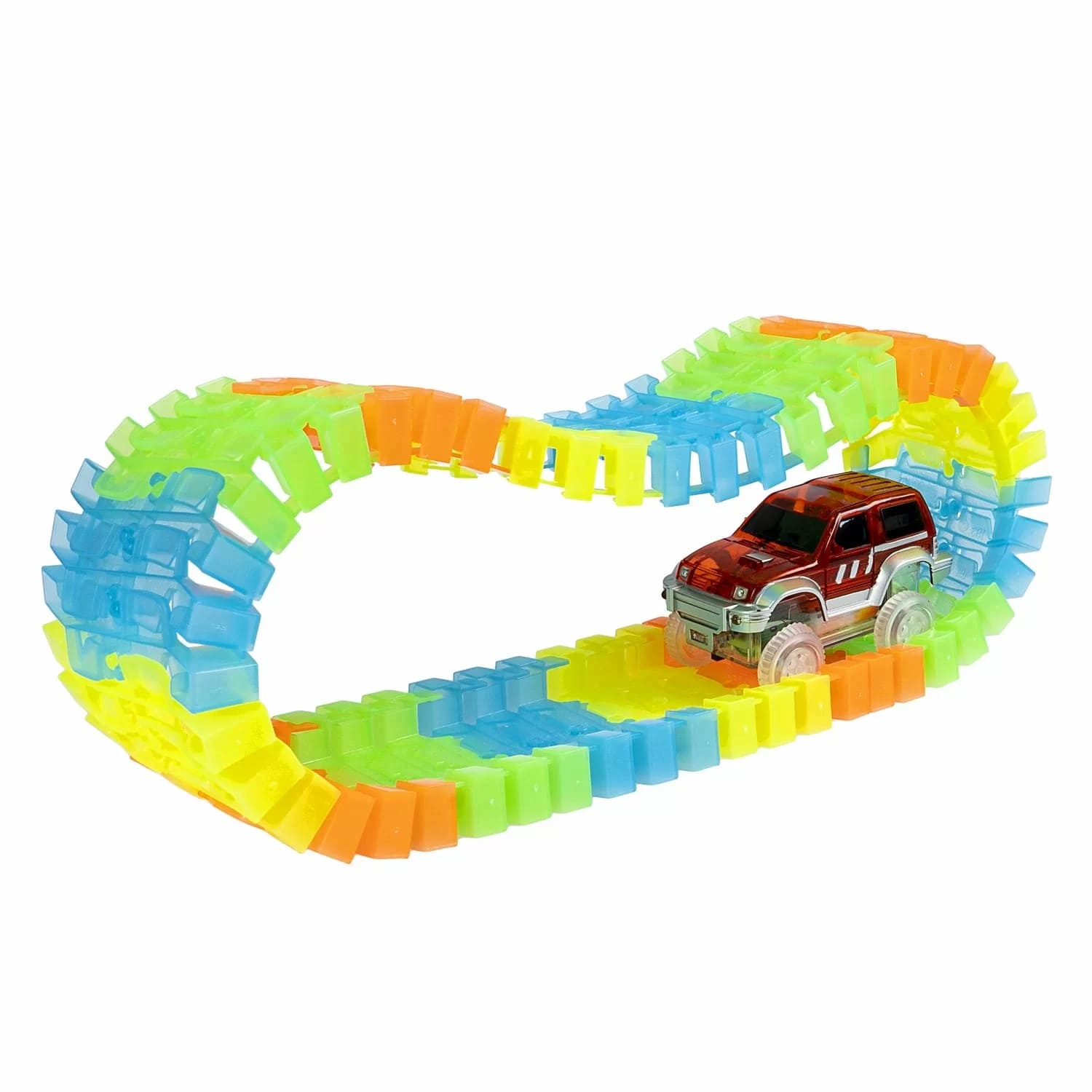 Постройте дорогу с горками, которая изгибается в любом направлении на 360 градусов. Соединяйте части между собой до щелчка и соберите путь так, чтобы гонка свободно катилась по нему. Включите машинку, оснащенную яркими светодиодами, и начните веселую сюжетно-ролевую игру. А еще флуоресцентная трасса светится в темноте!