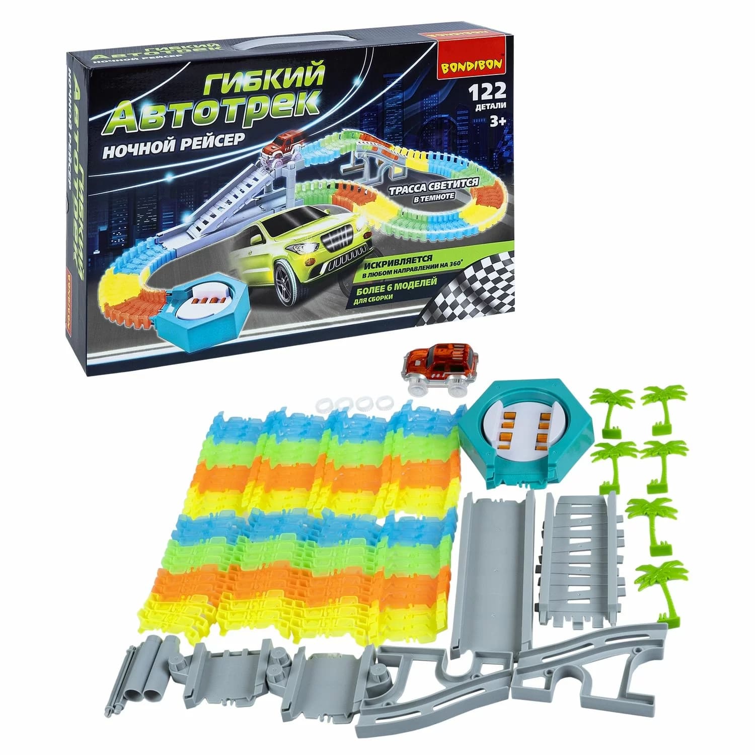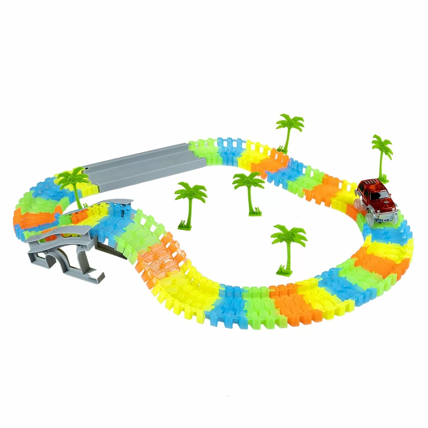 В набор входят: 96 флуоресцентных деталей для сборки дороги, 14 деталей для сборки моста, поворотный механизм, светящаяся гоночная машина, 4 шины, 6 деревьев. Понадобится батарейка АА (не входит в набор).