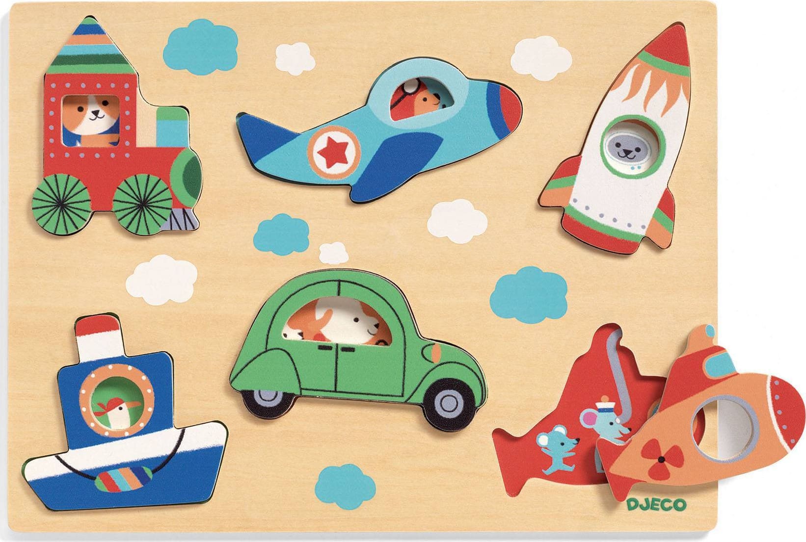 Комплектация: 6 деталей с изображениями автомобилей, самолета и корабля; рамки.