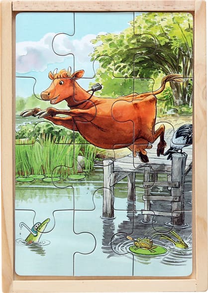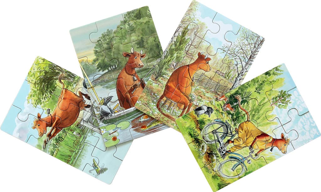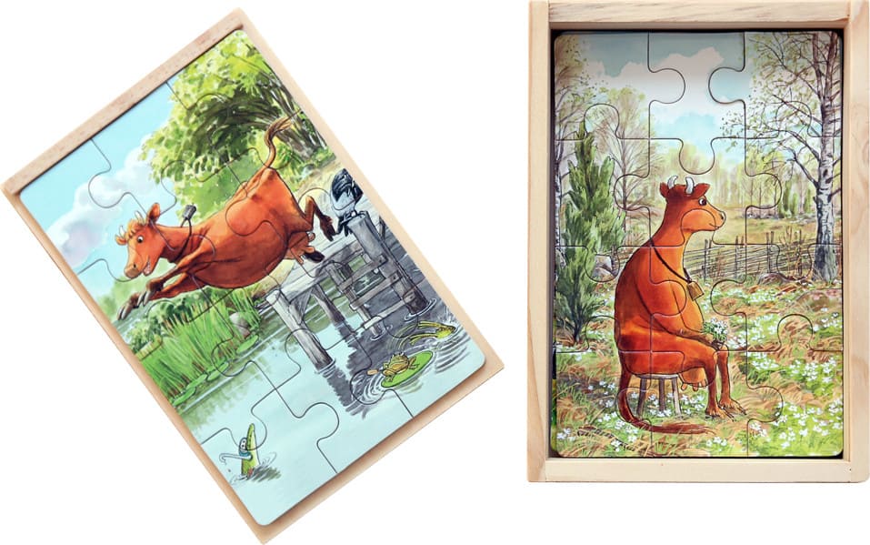 Набор из четырех деревянных пазлов в деревянной коробке. Каждый пазл состоит из 12 деталей.