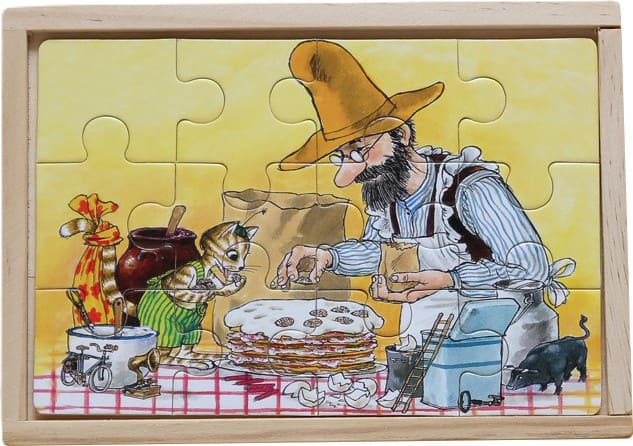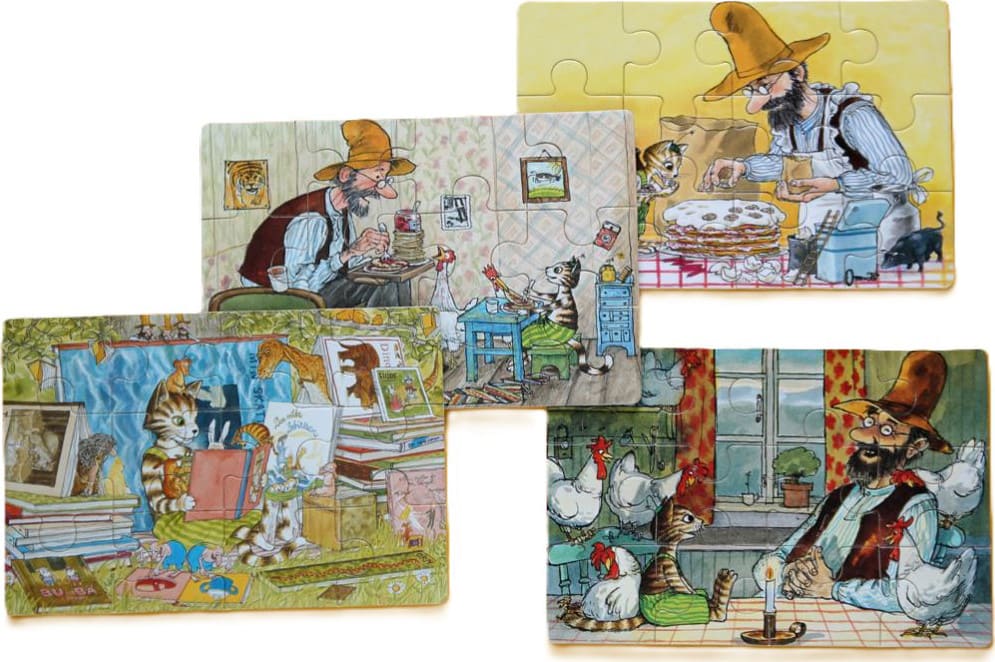 Набор из четырех деревянных пазлов в деревянной коробке. Каждый пазл состоит из 12 деталей.