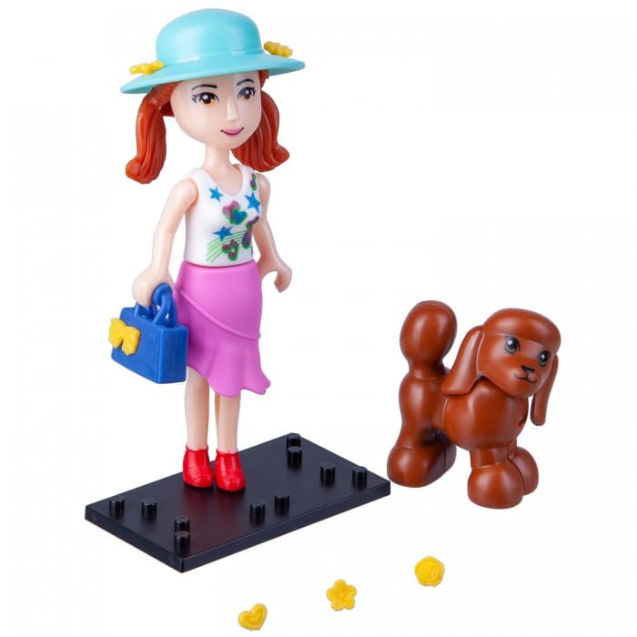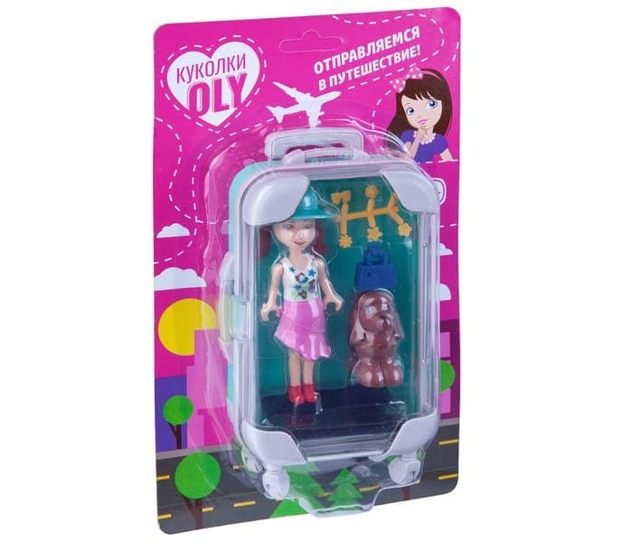 В комплект Bondibon OLY входят: куколка с подвижными конечностями, чемодан, подставка, сумочка и аксессуары-цветочки для ее украшения, фигурка коричневого пуделя. Все изделия набора сделаны из пластика.