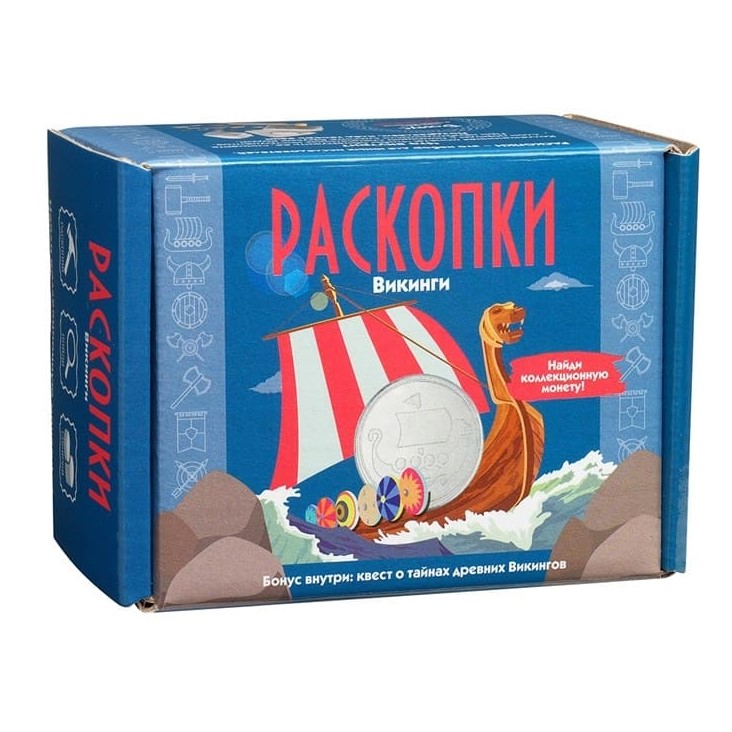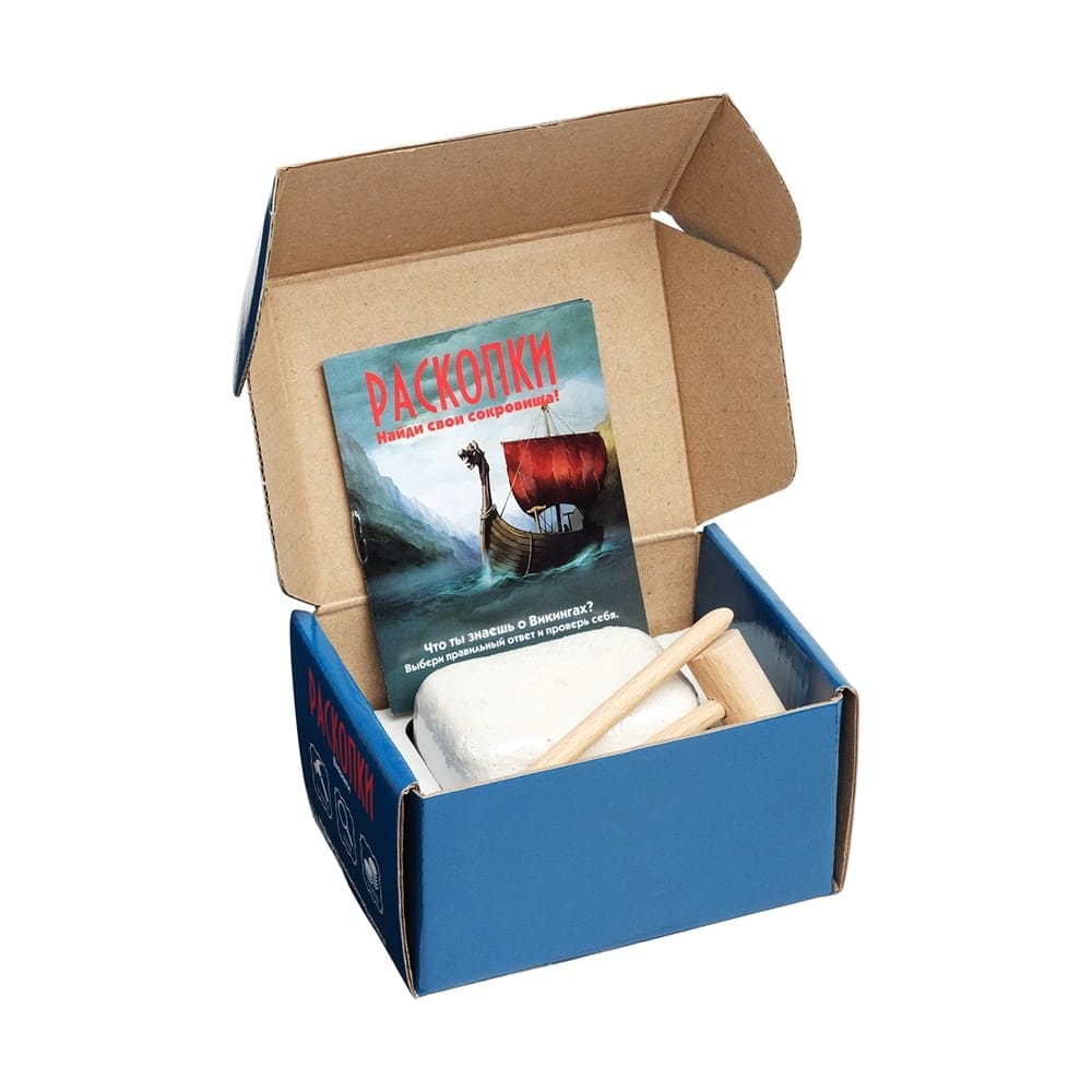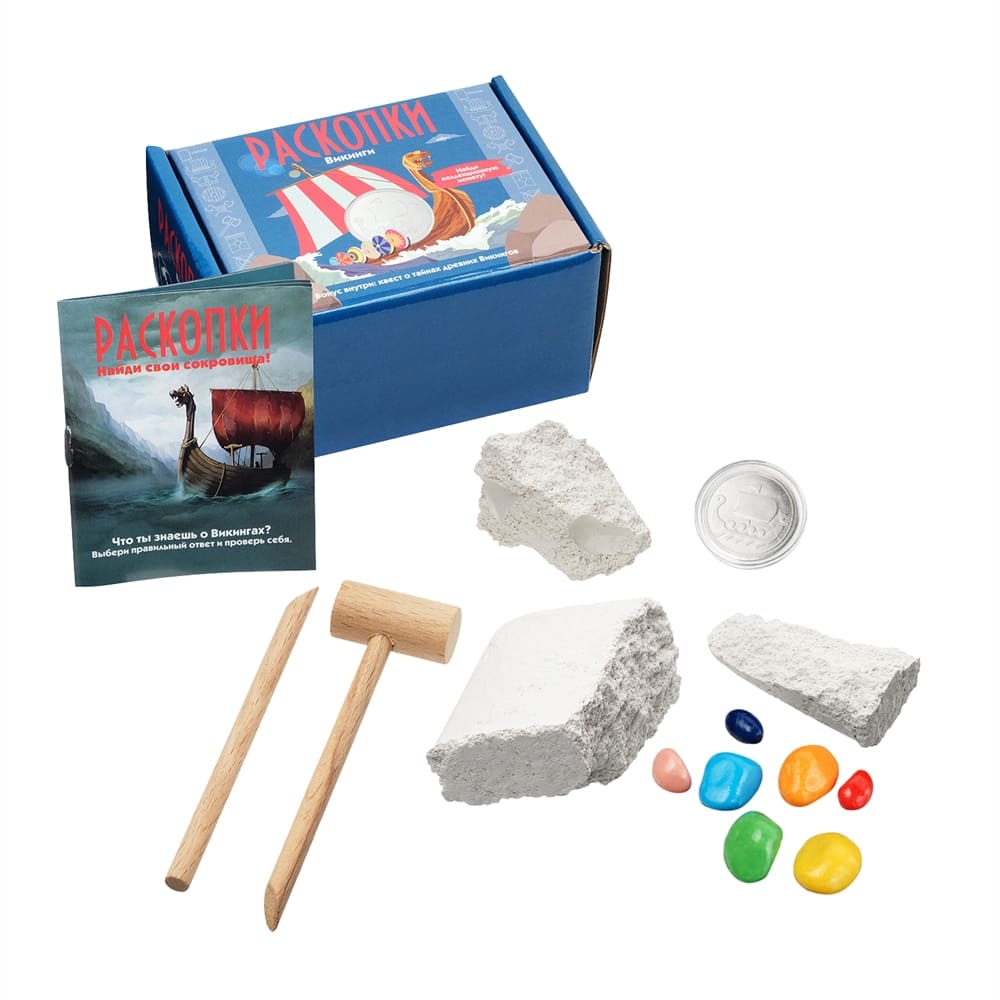 В наборе: брусок с артефактами внутри (россыпь природных камней, сувенирная монета из металла в коллекционном чехле из пластика), деревянный стек, деревянный молоточек, тематический буклет с викториной.