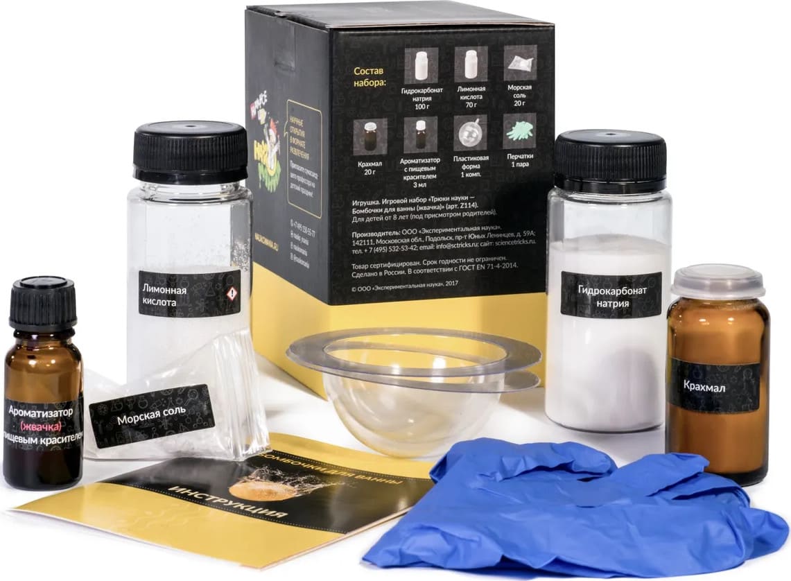 Бомбочки для ванны превращают купание в SPA-процедуру, благодаря эффекту массажа и полезным минералам в составе. Все эксперименты из набора можно проводить дома и в школе, соблюдая технику безопасности.