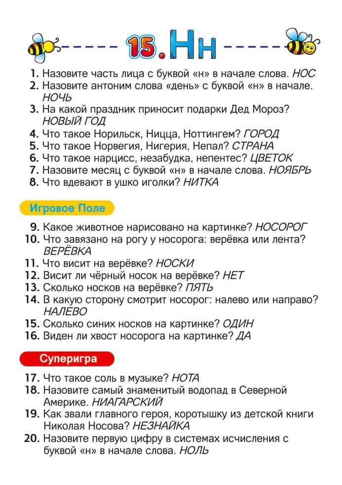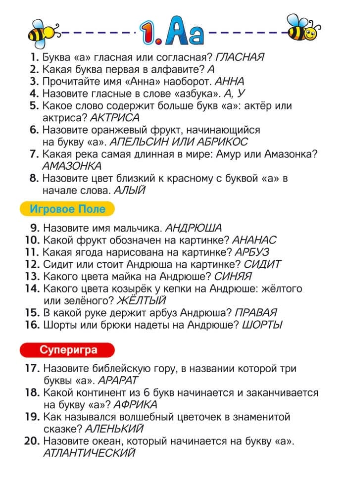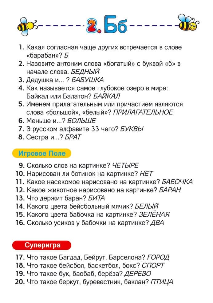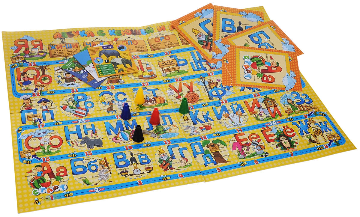 Придите своей фишкой первым до "Финиша" по игровой дорожке с 40 картинками Азбуки, правильно отвечая по очереди на вопросы карточек. Чтобы выиграть, очень важно развить хорошую зрительной памятью, ведь много ответов расположено на соответствующих картинках игрового поля и на фасадах вопросников.