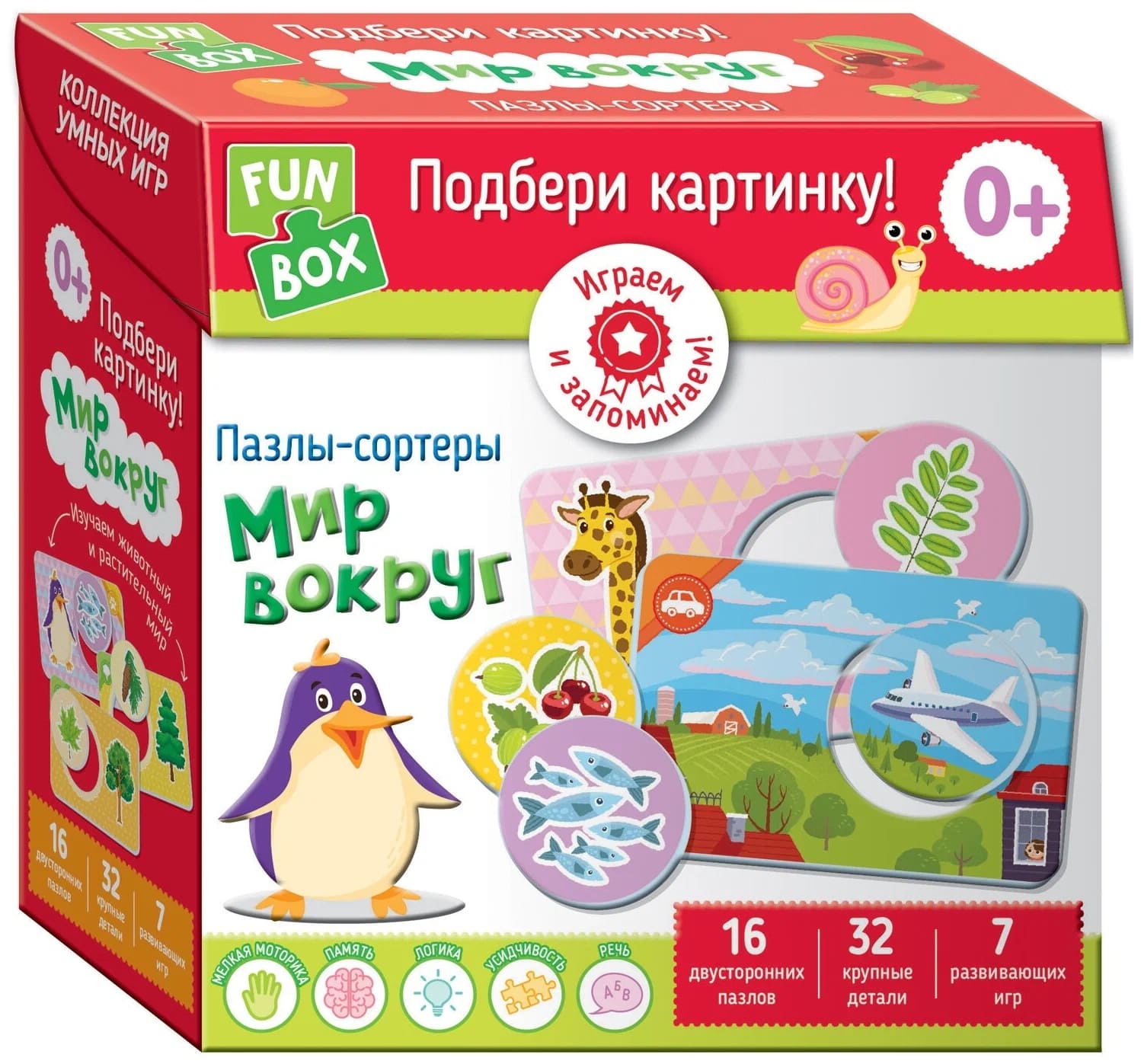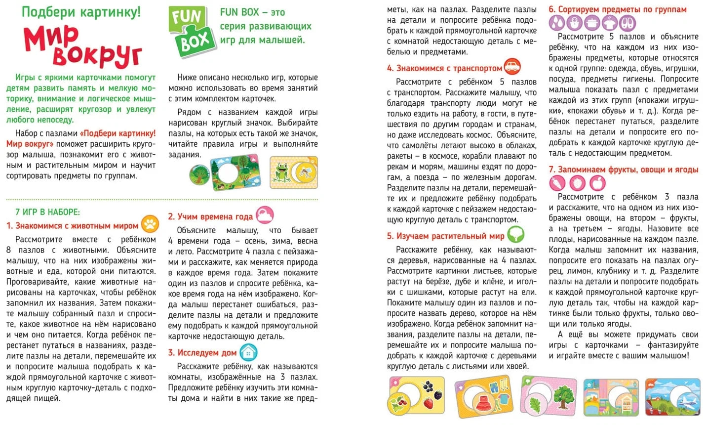 В наборе 7 игр, подробно описанных в инструкции, благодаря которым малыш познакомится с животным и растительным миром, транспортом, научится классифицировать предметы и запомнит времена года..