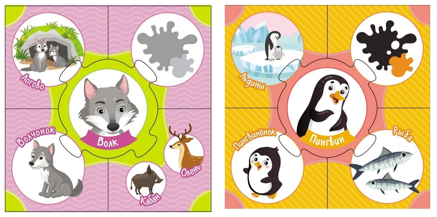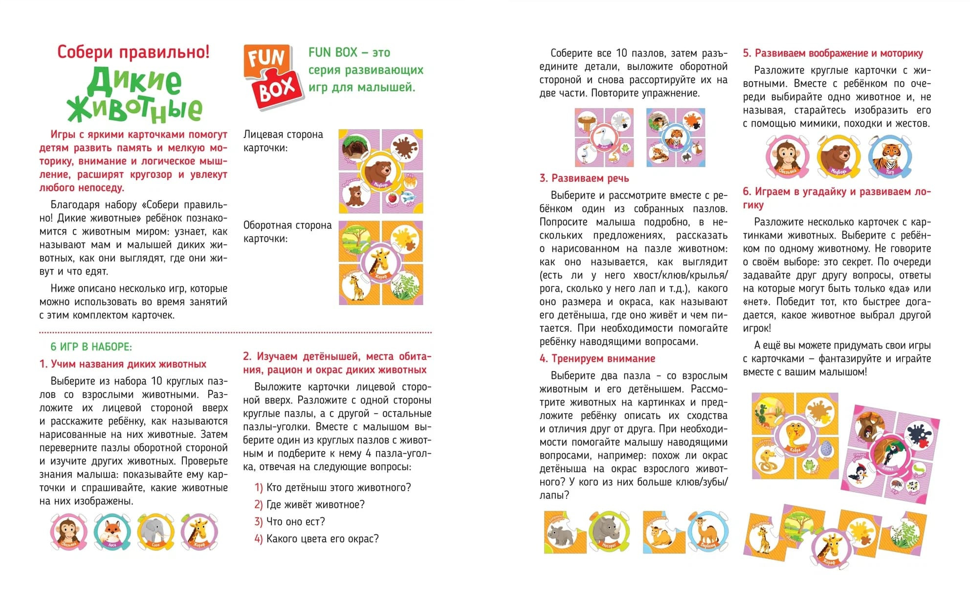 Вместе с Fun Box малыш: выучит названия диких животных, запомнит их среду обитания, рацион и окрас, узнает, как называют мам и малышей разных животных, расширит словарный запас, разовьёт воображение и мелкую моторику.