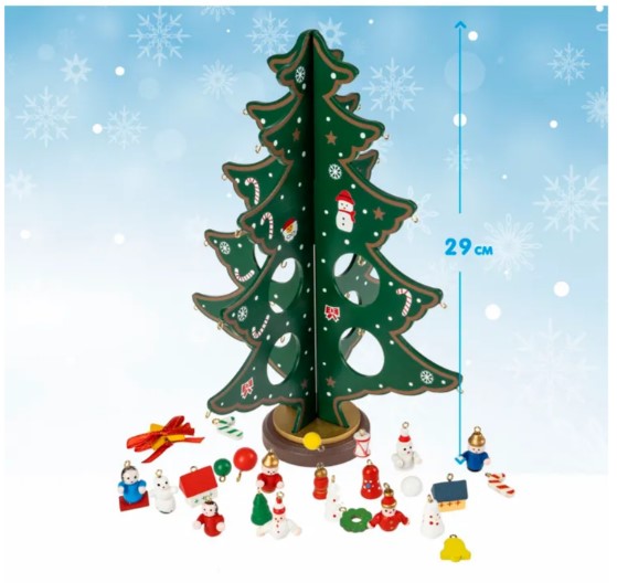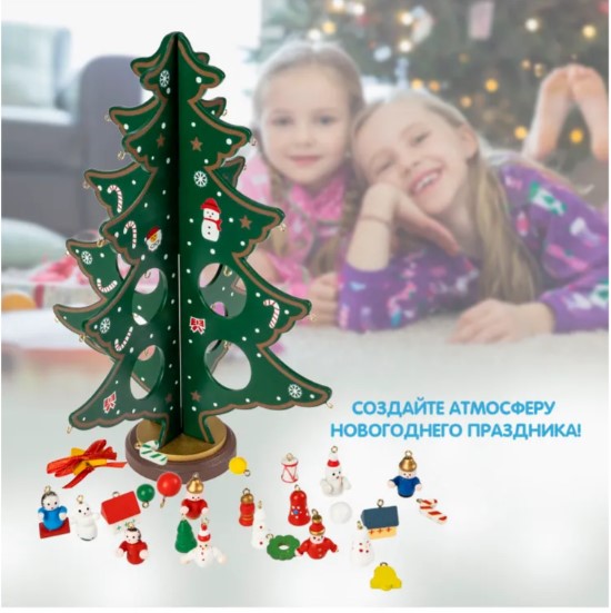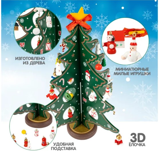 Работать с деревянным конструктором просто и очень интересно. Соедините две части каркаса и установите елочку на подставку. Украсьте ее милыми миниатюрными игрушками. Осталось только поставить сборную модель на видное место, например, на стол, и радоваться результату!