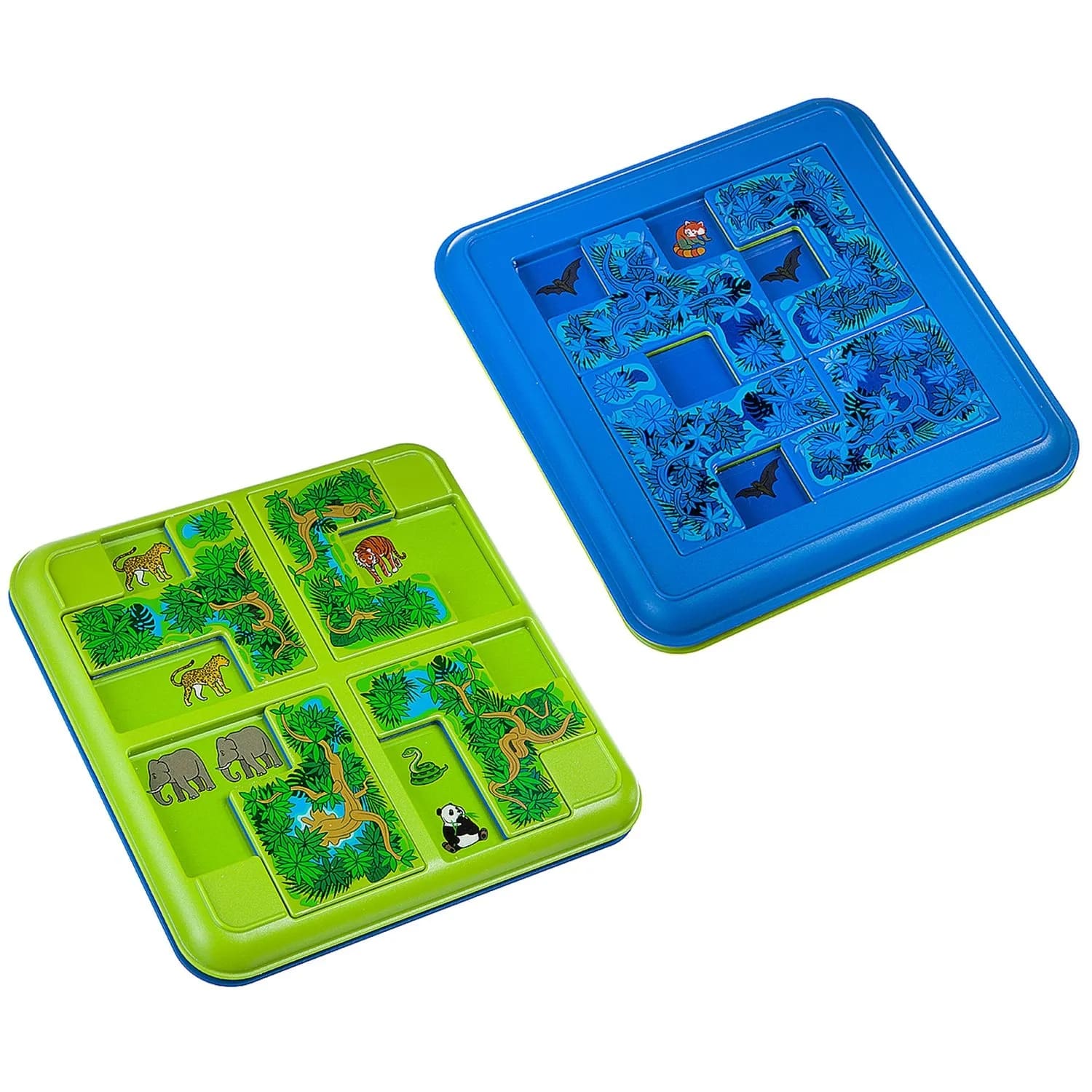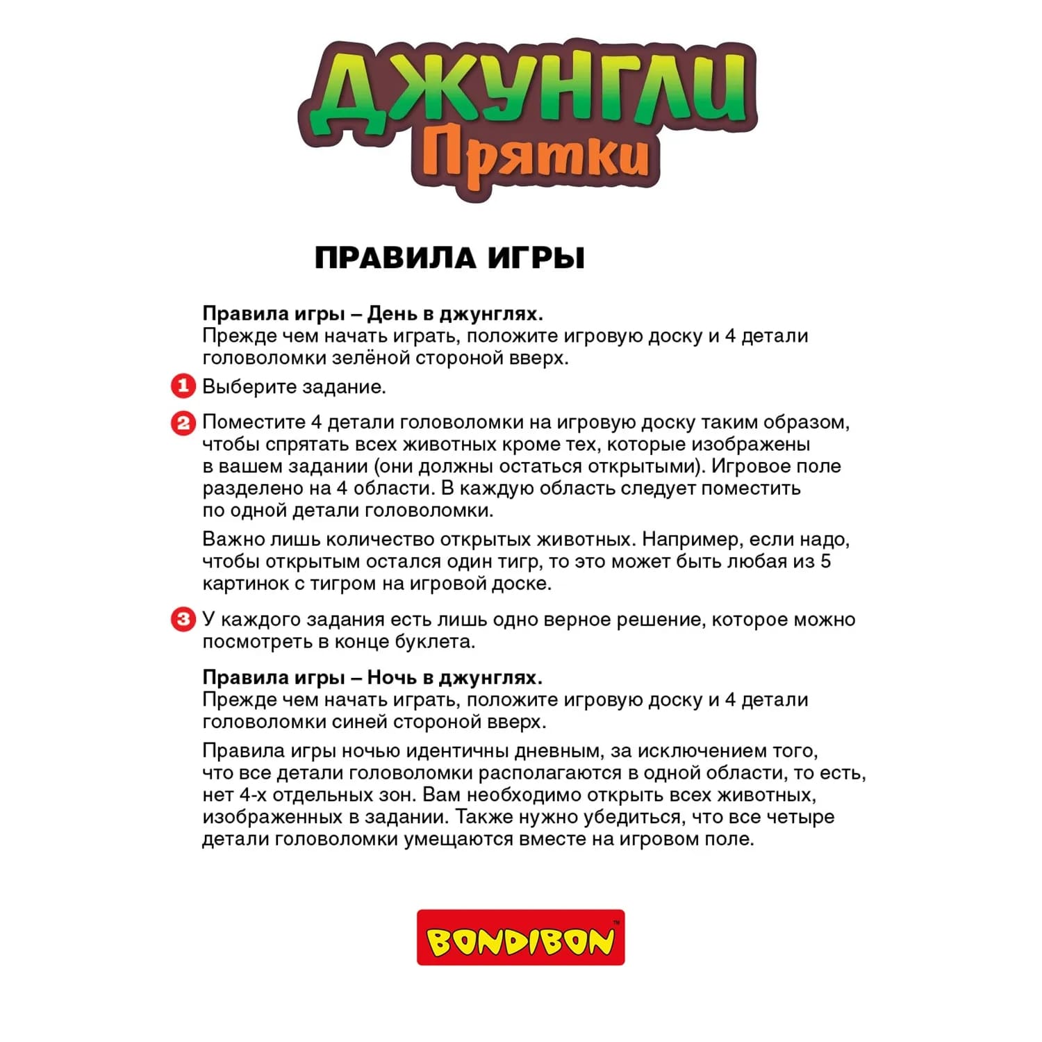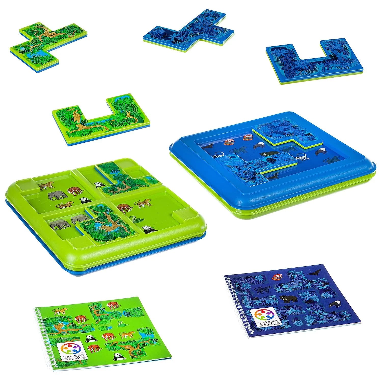 Выберите одно из 80 увлекательных заданий. Положите игровую доску и 4 детали зеленой или синей стороной вверх. Поместите по одной части головоломки в каждую область на поле так, чтобы спрятать всех животных кроме тех, которые изображены в задании. Найдите единственное верное решение и проверьте ответ по буклету. Постепенно переходите к более сложным заданиям.