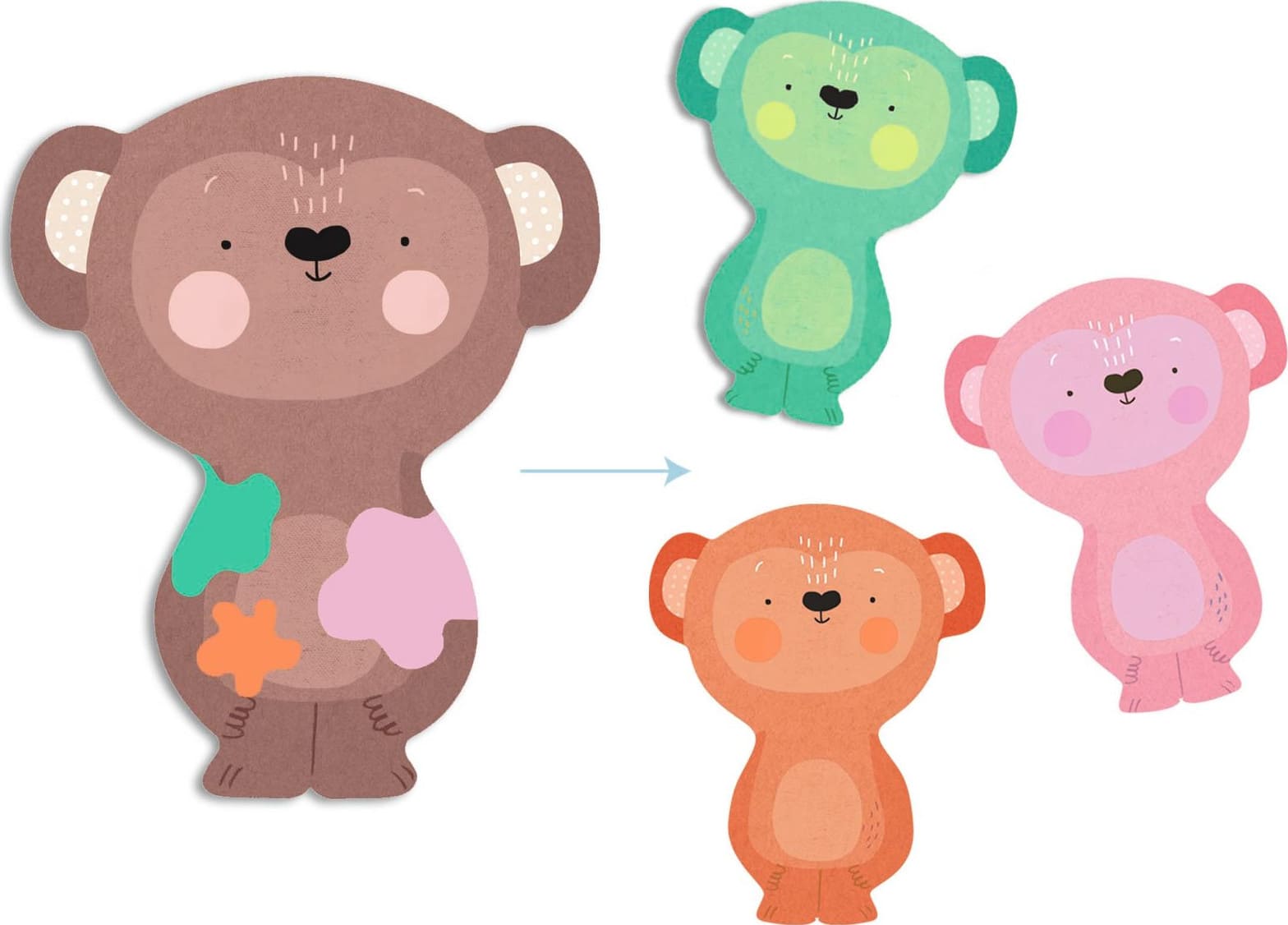 • В наборе: 3 разноцветных мам-обезьянок, 9 цветных детёнышей-обезьянок.