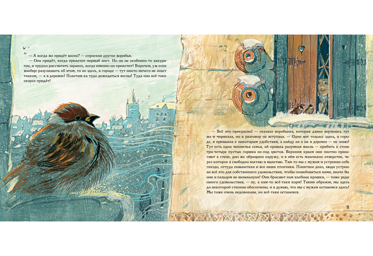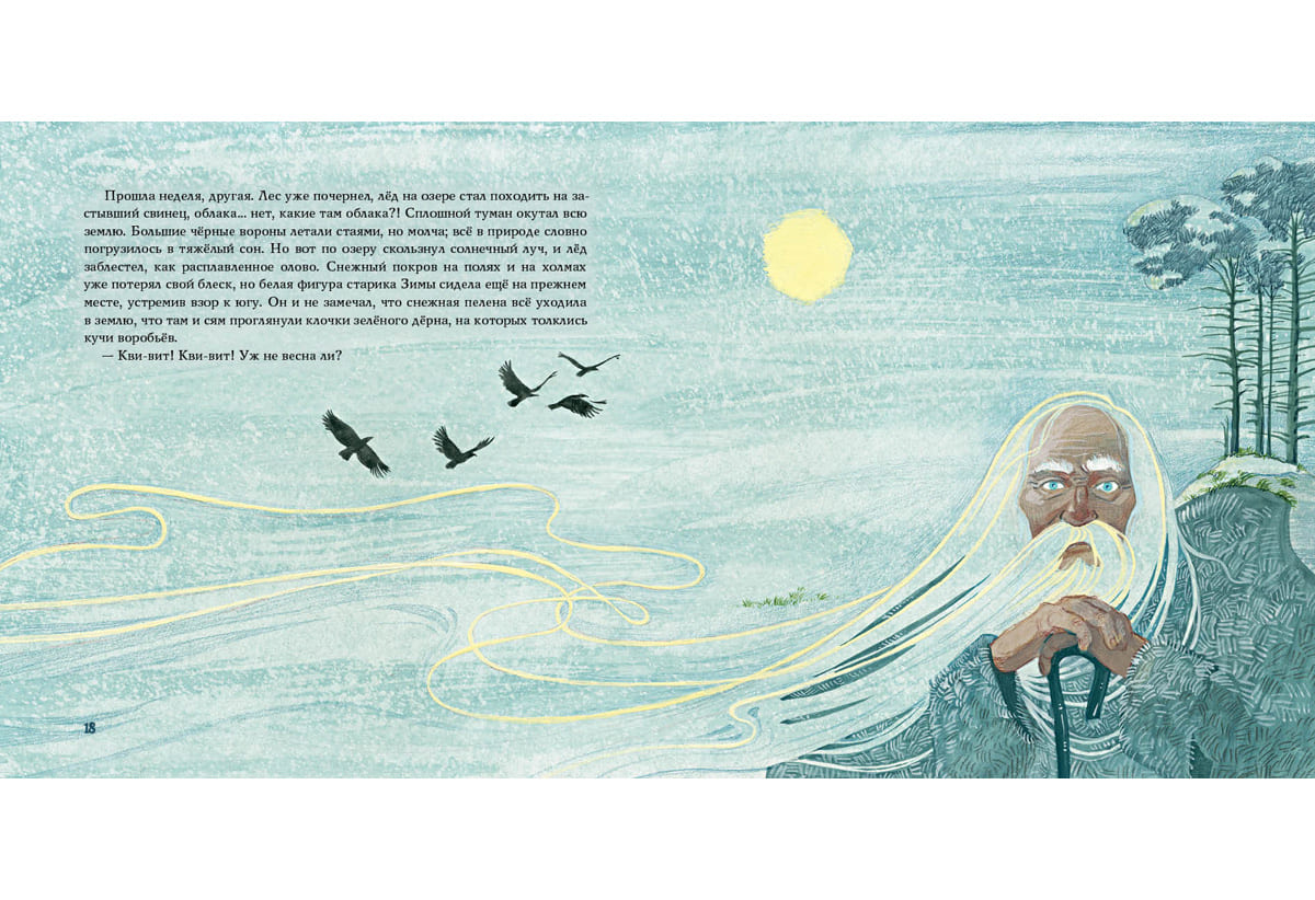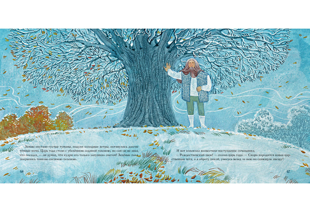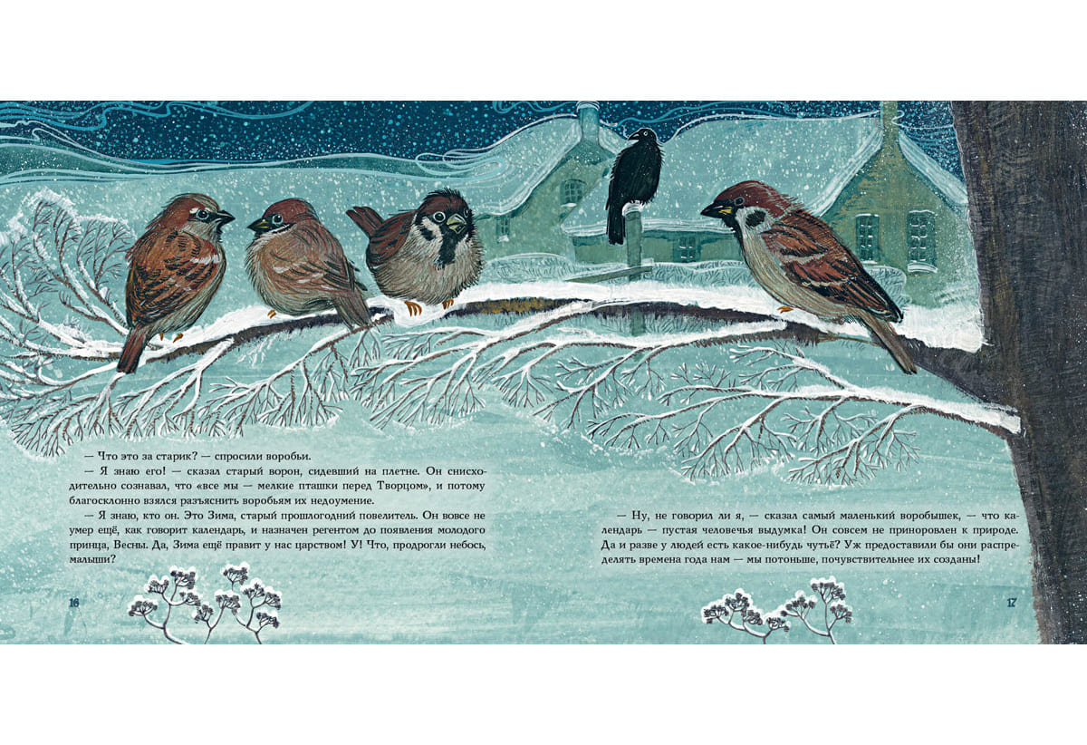 Однажды один старый воробей заметил, что Новый год наступает с приходом весны. А весна приходит, когда прилетают аисты. Два аиста приносят на своих спинах детей - мальчика и девочку. Дети растут, и природа оживает, наполняясь силами. Распускаются цветы, зеленеют рощи, солнце согревает землю... Наступает лето, юноша становится статным мужчиной, а девушка - прекрасной женщиной, его женой. Наливаются соком плоды, желтеют хлебные колосья... Наконец леса одеваются золотом, наступают холода, и жена повелителя года уходит на покой. А сам он, теперь седовласый старик, укрывает землю снегом и смотрит вдаль с высокого холма, терпеливо ожидая прихода новой четы...